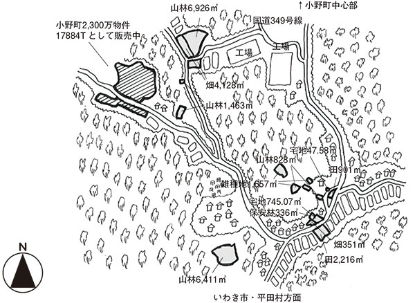 福島県小野町は小野小町生誕伝説があることで有名で、阿武隈高地の中部に位置し、自然環境の豊かな市町村だ。磐越道とあぶくま高原道路が整備され、どこからでも車でアクセスしやすい移住先の候補地としていま注目されている。物件は阿武隈高地を南北に縦断する国道349号線沿いに位置しており、建物は空き家歴10年以上のため大幅なリフォームか解体が望ましい。更地にすることで駐車場や資材置き場・直売所等、様々な用途に活用出来るだろう。宅地以外にも山林や田畑の飛び地があるため、敷地の一部のみバラ売りも相談可能だ。飛び地の中でも平坦な箇所はエネルギー用地として転用も見込める。
