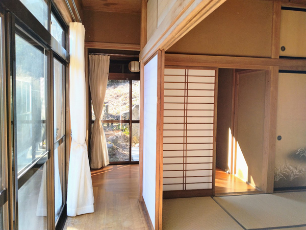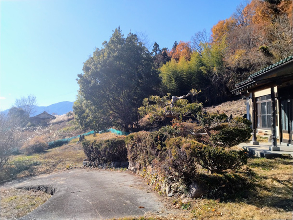 北杜市須玉町東向地区。増富ラジウムライン沿いの昔からある集落の中にある本物件。増富ラジウムラインより100mほど入った場所に位置する。敷地は約275坪、南隣地からは一段高い場所にある。敷地は、東西に長く日当たりがいい。建物は、昭和58年築の平家建て、全室和室の純和風住宅。間取りは、7帖、10帖、8帖、6帖の4部屋の和室、そして7帖の台所、浴室。続き和室があるゆったりとした空間で、畳の風合いが気持ちいい。明るい縁側からは、里山の景色を楽しむことができる。住宅の東側には物置がある。敷地には畑が含まれているので、農地法の許可が必要になる。なお、敷地への進入路はきわめて狭い。