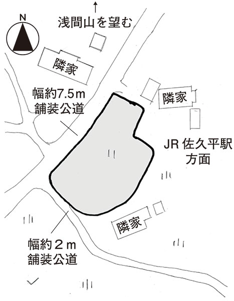 | 接道状況 | 北西側が幅約7.5m、南側が幅約2mの舗装公道に接する |