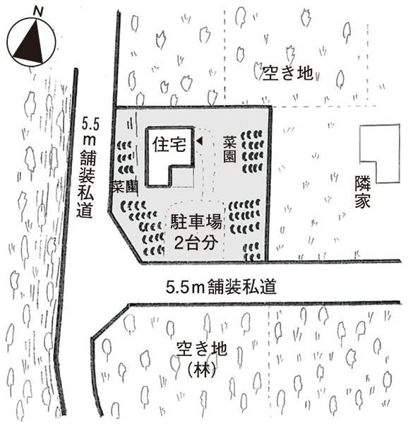 | 接道状況 | 南、西が幅約5.5mの舗装私道に接する。 |