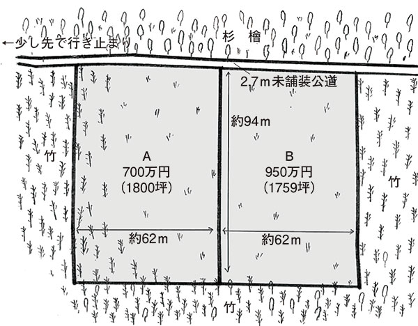 集落を抜けた畑が広がる高台。その畑を抜け雑木林に入って行くと、別天地のように明るく空が開き、広い空間が出現する。そこは竹が伐採されている約1800坪の2区画だ。住宅を建てるのはもちろん、簡易建物を置き週末畑や遊び場、ドッグランなどとしての用途でも良い。外から干渉されることもないので、自分達だけの空間が持てる。進入路は未舗装だが公衆用道路であるのも嬉しい。竹林独特の雰囲気が好きな方にも薦めだ。2区画まとめて購入してくれるのも大歓迎。