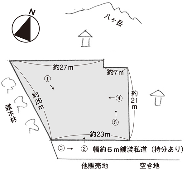 接道状況 | 北側が幅約6mの舗装私道に接する(持分あり) |