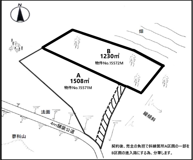 | 接道状況 | 東側が幅約7.5mの舗装公道に接する。北側が幅約2.5mの舗装公道に接する。 |