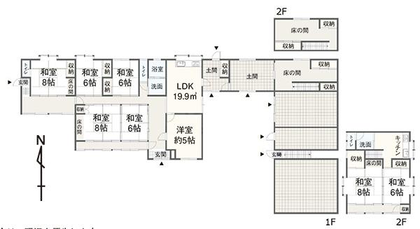 広島県北広島町は2005年に千代田町・大朝町・芸北町・豊平町が新設合併して誕生した比較的新しい市町村。町内に鉄道路線はないが中国道と浜田道が通っており、中心部の千代田IC付近は企業誘致に成功し物流の拠点としても機能している。そんな千代田ICから車で3分の立地にあるのが今回の物件で、中国地方の民家で最もクラシックな茶褐色が特徴な石州瓦民家。居室は和洋8部屋ある他、母屋と連続している物置部分もあるため1階部分は東西にとても長い。先述の通り周辺は雇用に恵まれていることからアパートも多く、2世帯住宅な間取りを活かして民泊や賃貸物件として活用する手もありそうだ。
