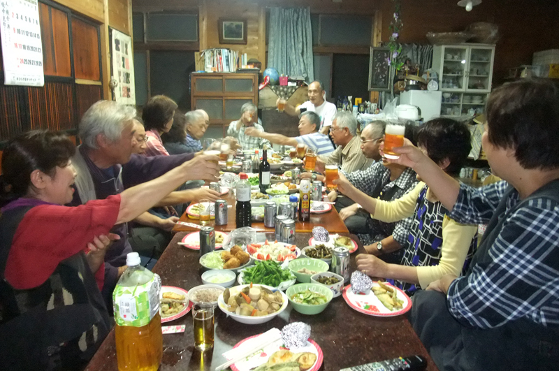 ▲エダマメの収穫祭で。おいしいエダマメが出来たことに感謝してカンパーイ?