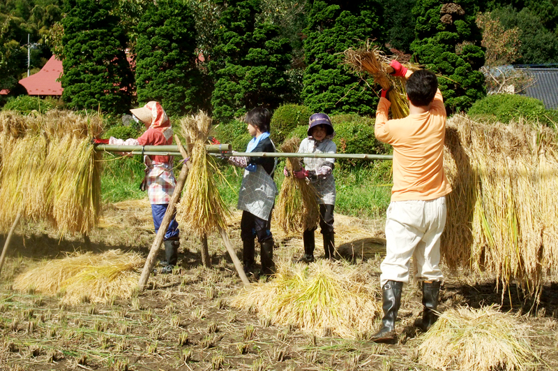 ▲家族揃って稲掛け作業中。一年分の食糧米確保の為の大切な仕事と思うと、張り合いがあるようです。