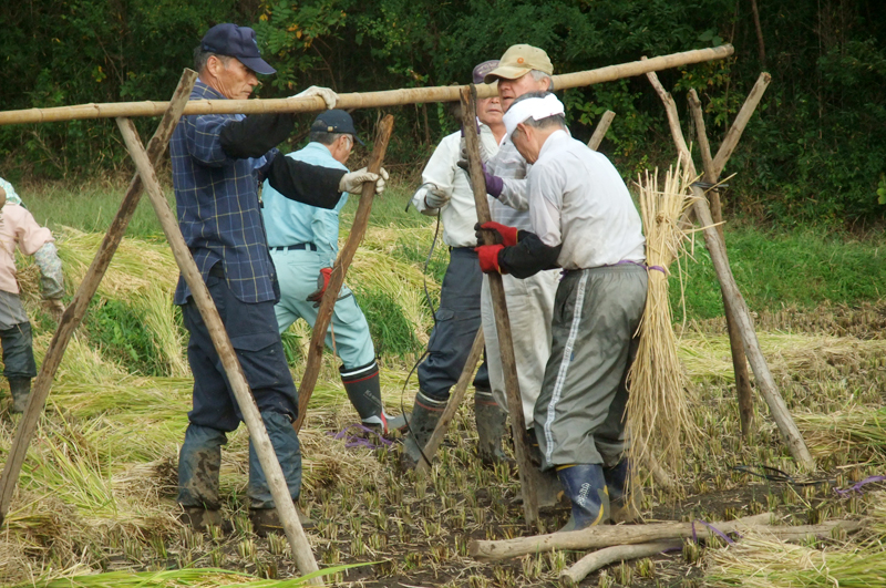 昨日のうちに稲を刈り倒し稲は架さを作っておいたので、あとは引っ掛けるだけです。「サァ~頑張ろう~!」と我が娘の掛け声で、「稲束を運ぶ人」、「引っ掛ける人」、「手刈りでバラになっているのを束ねる人」と分担作業で段取り良く働き始めました。