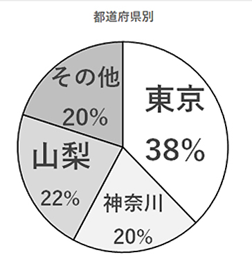 首都圏在住者が約 6 割を占めて います。東京、神奈川の西部方面は山梨県へのアクセスが他地域と比べて容易であり、自宅から1時間半程度で出かけられるという群を抜く距離感が購入につながっています。山梨県内の購入者は地元というより も都会からの移住者で賃貸居住者。職場を見つけて3年目など購入の条件を整えて来られた 30、40 代の子育て世代です。