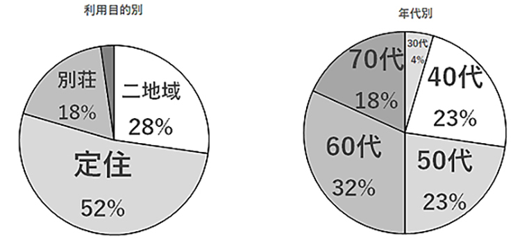 50 代、60 代が購入者の中心となっています。都会で資産形成された方々を含めリタイア後に自然豊 かな地域で暮らすという傾向は、ひとつの生活スタイルとなっています。相談会などに若年者が参加される多くが賃貸希望で、安定した仕事や住宅ローンなど、条件が合えば四分の一以上が物件購入に進む傾向がはっきりしてきました。一方で70 歳を超える高齢者も一定程度いらっしゃいます。孫のためにという、強い動機に基づいた方々でした。