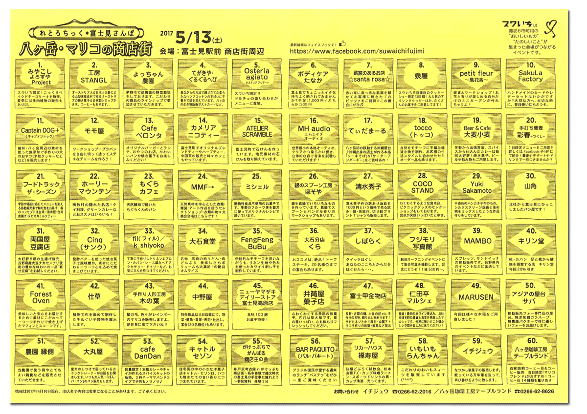 来たる5月13日(土)10時~16時でJR富士見駅前の商店街で「スワいち」が開催される模様。ちょっとレトロな駅前道路の店舗ですが、覗いてみると新しいコンセプトのお店が増えていて、イベント時はどうなるか楽しみ。