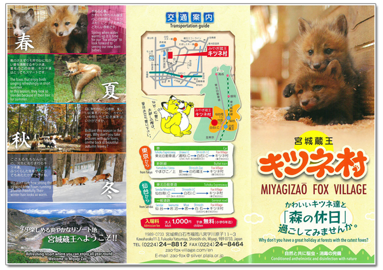 A4版8頁の表紙に見なれない動物の顔写真が載るパンフレットが町役場からどさっドサッと届きました。「蔵王町の観光パンフレットに動物が?」「ハテ、肥ったタヌキか」と見ましたが、「ハハン」と合点したのは、これは蔵王町の隣、白石市郊外にある「キツネ村」にいるキツネのクローズアップに違いありません。