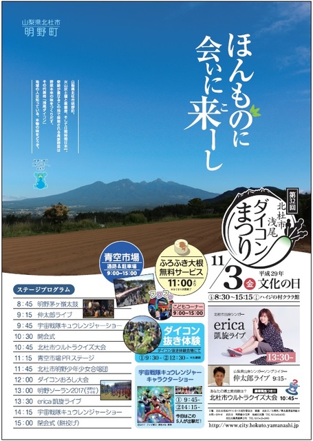 北杜市明野町では恒例の「浅尾大根祭り」が開催されます(11/3文化の日)。冬場の食糧不足を乗り切るため降雨に乏しい地域で漬物用にと広まった「浅尾大根」ですが、鍋物に欠かせないタネでもあり、快晴の茅ヶ岳の裾野は毎年家族連れの賑やかな歓声に包まれます。