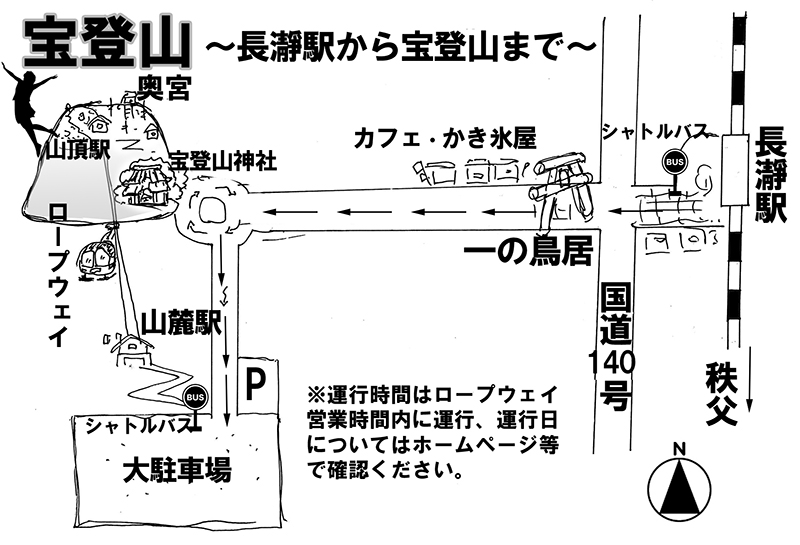 また、宝登山の麓には秩父三大神社のひとつ・宝登山神社、山頂には奥宮があります。ちょっとしたパワースポットであり、長瀞駅からロープウェイの乗り場までは歩いても行けますが(徒歩約20分)、駅前から無料シャトルバスが運行しています。