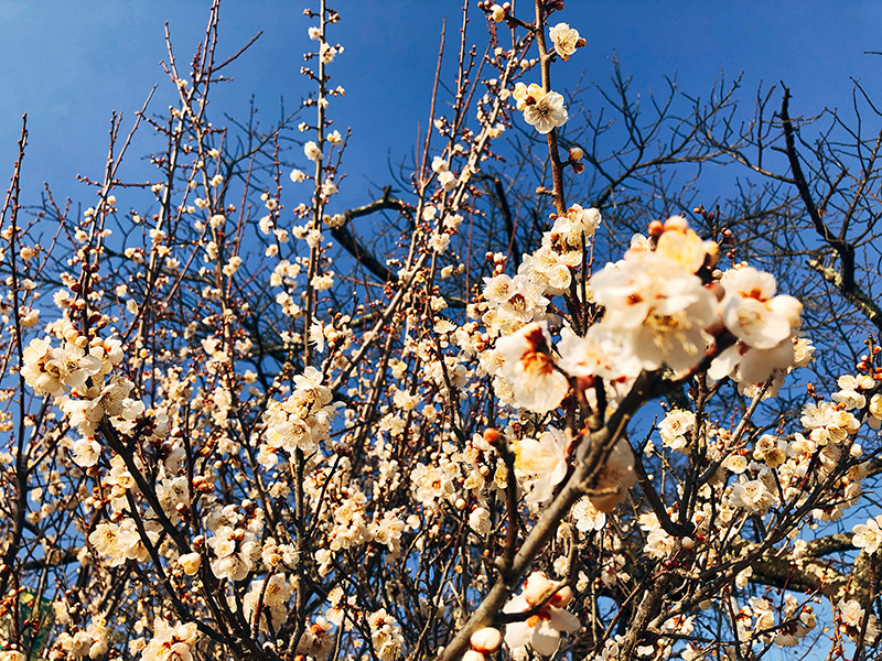 ロープウェイで登れる標高497mの山頂に咲く臘梅は、少し冷たい冬の青空の下、普通の梅と比べて小さく、うつむき加減の薄黄色の花が、ほんのりと甘い芳香とともに雄大な斜面を彩ります。臘梅は800株、約3000本あり、同じく山頂にある梅百花園では、2月上旬から3月下旬にかけて約170種、470本の梅が咲きます。3月上旬からはさらにしだれ桜が見頃を迎え、これからの季節、4月上旬から中旬にかけては桜、4月下旬から5月中旬にはツツジ、5月中旬から6月中旬はシャクナゲと移り変わります。秋になればライトアップされた紅葉が楽しめ、10月から12月にかけては冬桜、まさに四季折々の草花が楽しめます。