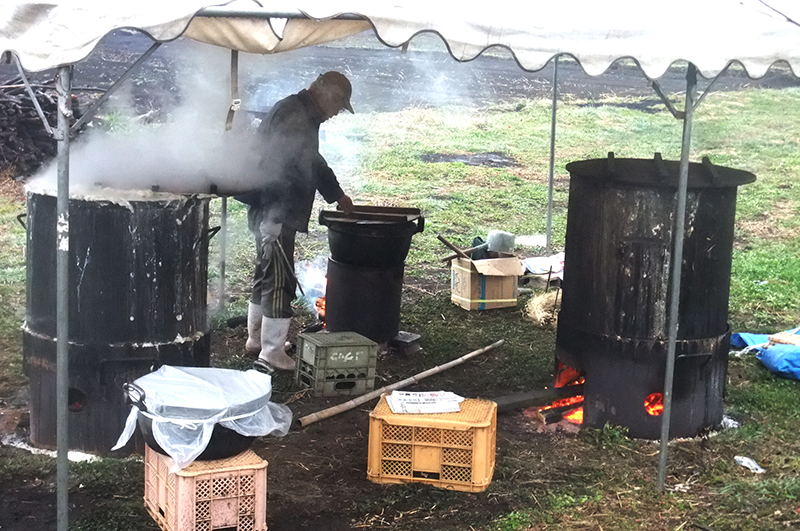 早朝4時半、気温2℃。底冷えのする真っ暗闇の中、大豆の入った大釜2つに火を付けるが、なかなか燃え付かない。ちょっと焦ったがカマド焚き22年の経験、あの手この手で無事薪に燃え付き、オレンジ色の炎が立ち昇ると、やれやれこれで大丈夫と一安心。いつも7時頃に吹きこぼれることを目安においているのですが、今日はちょっと遅れました。