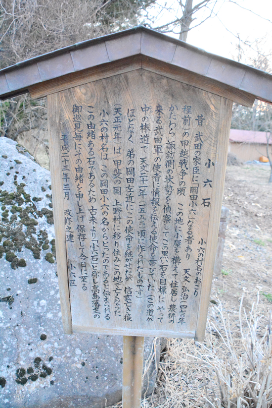 さらにこの「小六」という名前、戦国時代にこの地に暮らしていた「岡田小六」がそのルーツとされています。武田の家臣だった岡田小六は、甲斐の国(現在の山梨)に諏訪側の情勢を偵察、耕作のかたわら、石の裏に密書をしたため、武田方の使者に伝えていたそうです。