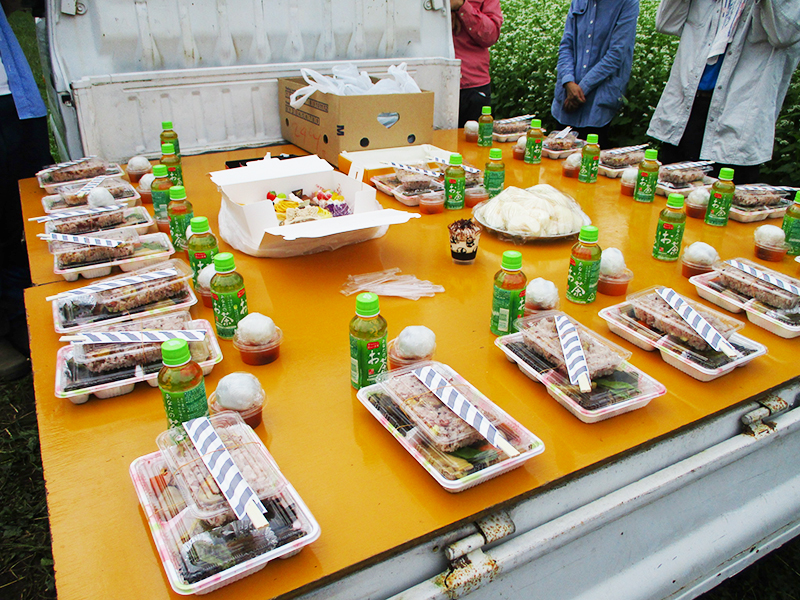 昨日、枝豆班長さんが急ぎの連絡で「都合の良い人だけ集まって下さい!」と声を掛けたところ全員で21人も集まりました。枝豆畑と蕎麦畑の間の通路に軽トラックを止め、その荷台にコンパネ2枚を敷いてとりあえずのテーブルを作りました。その上に私の作った栗おこわと田舎膳弁当、そして仲間から差し入れのケーキ、果物、手作りまんじゅう等が所狭しと並んでいます。見頃に咲いた蕎麦の花をバックに記念の集合写真を撮った後、テーブルの所に集まり、枝豆収穫を無事迎えられたことに感謝し「お疲れ様でしたー」とお茶でカンパイしましたが立食なのでゆっくりできず皆さんお持ち帰りされた様です。コロナ禍のご時世で形ばかりの収穫祭と蕎麦の花見でしたが、何ヶ月も皆さんにお会いしてなかったので、久しぶりに見る元気な笑顔にほっとひと安心しました。