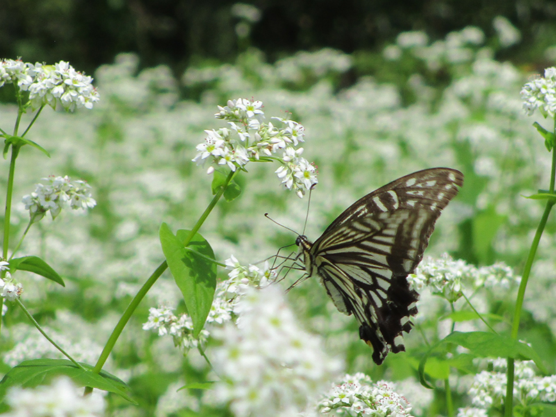 ▲天気の良い秋の1日。枝豆は食べ頃、白い蕎麦の花が一面に咲いている。