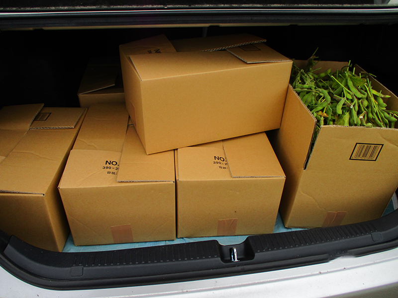 ▲親戚・知人に送る枝豆を収穫中。「おいしかったよ~」の言葉を聞くのが張り合いになるとか・・・。