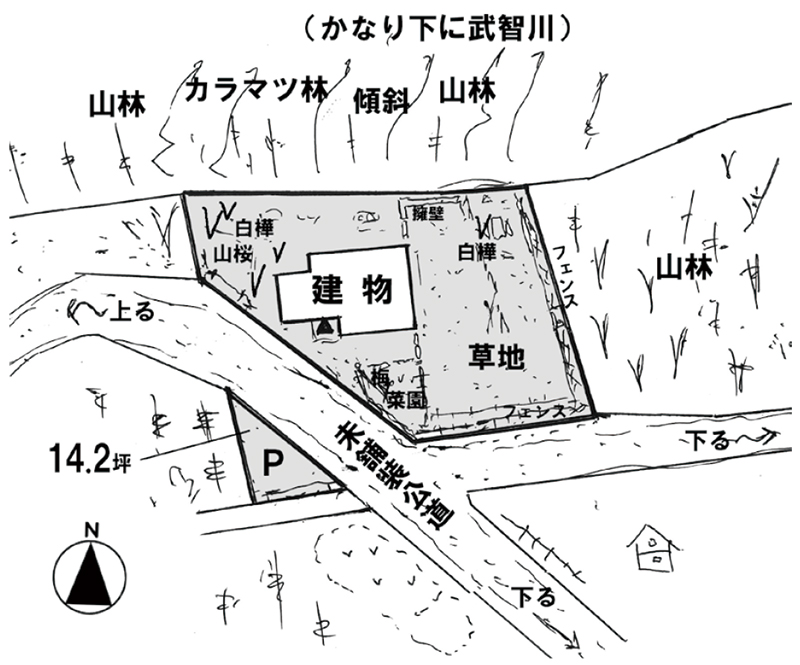 物件は弊社でも移住者が多いメインストリート沿いのちょうど角地に位置します。北側隣地が傾斜地で、下りることはできませんが、下に武智川が流れ、せせらぎの音と冷涼な風を感じます。敷地は道路を挟むように駐車スペース、東側に広く囲われた独立したお庭があるのが特徴です。動物の放し飼いやバーベキュー、菜園・ガーデニングなど考えられます。