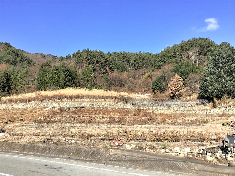 国道20号線を小瀬(こせ)の先「蓬沢(よもぎさわ)交差点」で右折すると景色が一変する。集落を過ぎて御坂山系へと向かう県道は、いつのまにか畑の真ん中を走っている。
