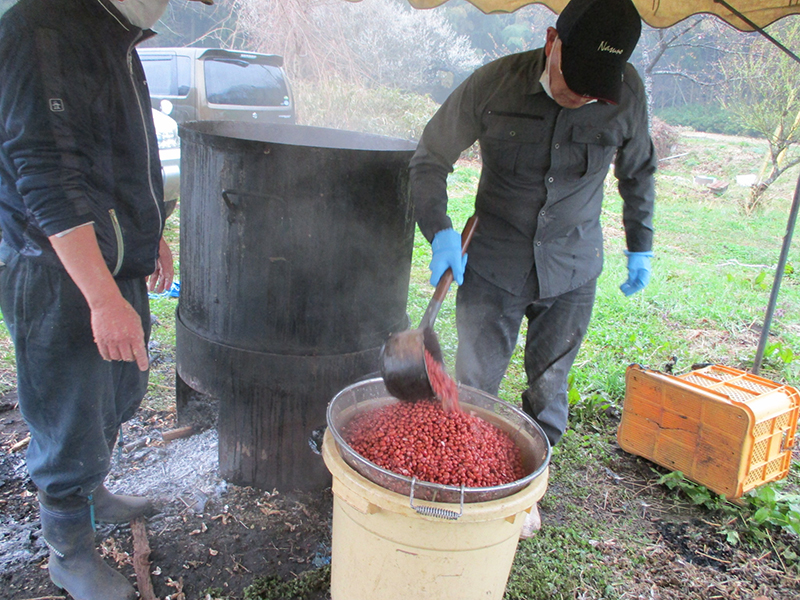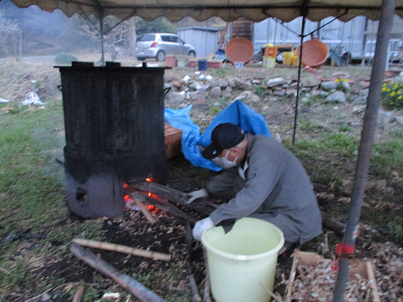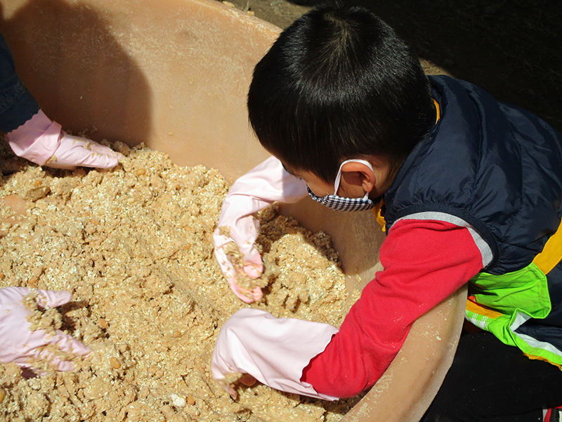暑いくらいの素晴らしい天気に恵まれ、仕込み作業が捗りました。私の「田舎料理」が大好きという男の子が、今年もお母さんと一緒に来ました。「サァ~始まるよ?!」とお母さんに促されると大きな手袋をはめた手で桶に中の煮大豆、こうじ、塩を良~く混ぜ合わせ始める・・・もう何度もやっているので慣れた手付きでお手伝いをしています。