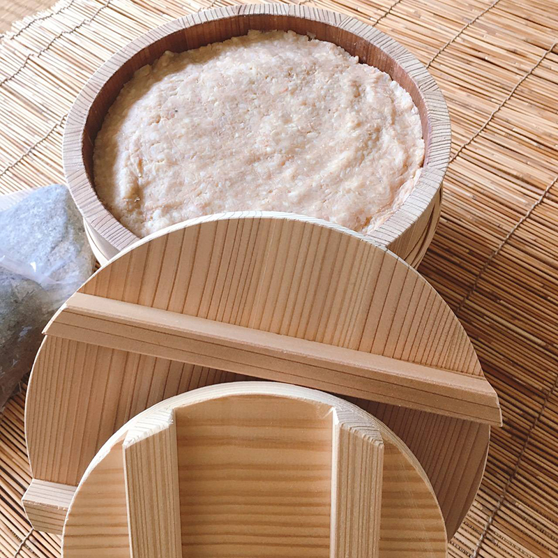 娘は木桶の使い方を調べて一晩水を張ってタガを締め準備をして待っていたらしく、届くとすぐおままごとの様な「味噌仕込み」をやったと連絡が来た。しかし私の目分量がぴったり過ぎ?!でほぼ口ぎりぎりで中蓋を載せると味噌の神様の重石が入らなーい!と言って来た。その後一部取り出してタッパーに移したその写真を見ると、蓋の上に重石が載っている・・・それを見て重石の役目を伝えると「わかった!やり直す」と言ったきりでその後どうなってことやら・・・。