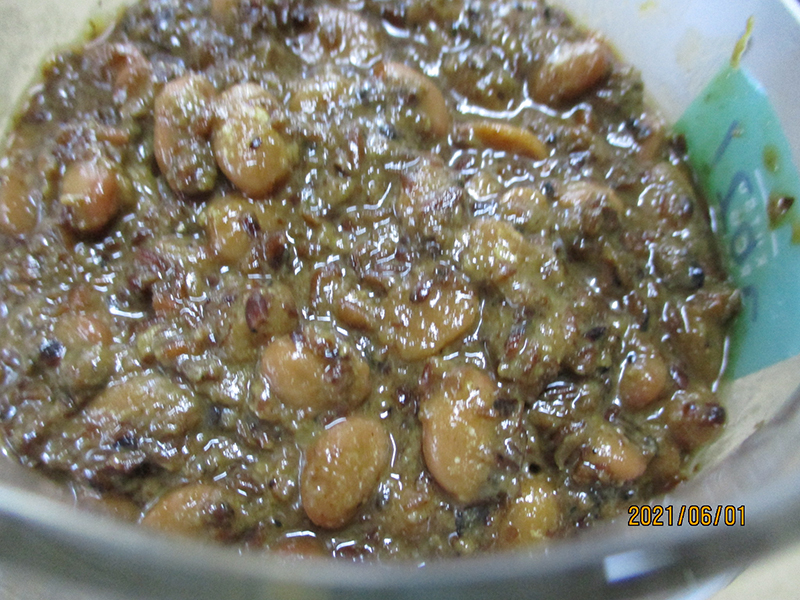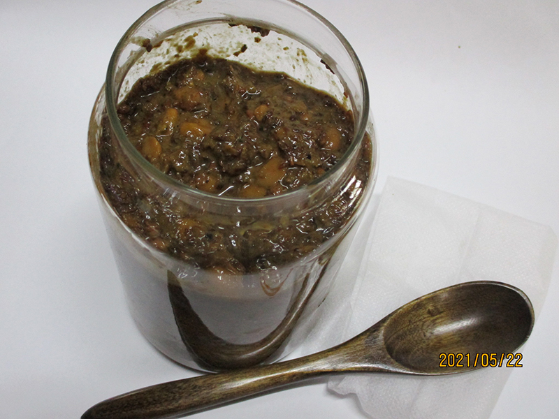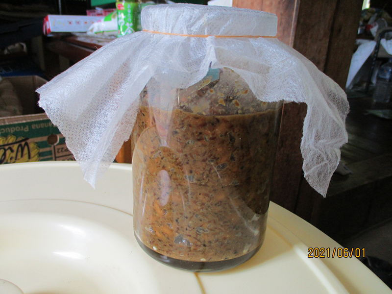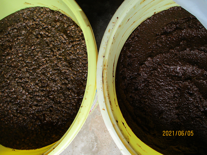 ▲去年の諸味大豆が分解され色も濃くなって来ました。右側→今年届いた諸味でまだ香ばしいにおいがします。