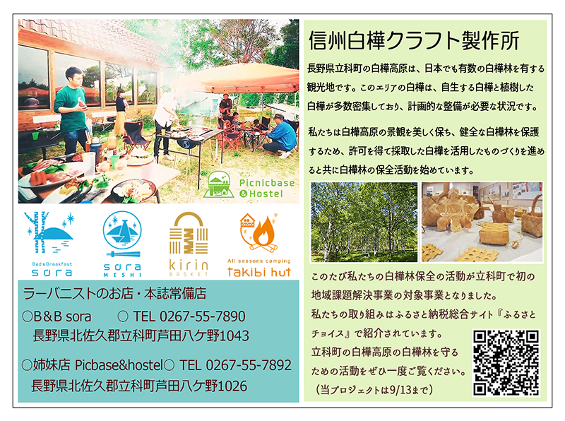 本誌2015年12月号のラーバニスト訪問でも登場頂いた渡部見さん・ゆかりさん夫妻からDMを頂きました。長野県立科町の女神湖湖畔で「B & B sora」を開業、その後、ジビエ料理の加工場・居酒屋、そして「バンガロー・キャンプサイト焚き火hat」などを事業展開中の方です。