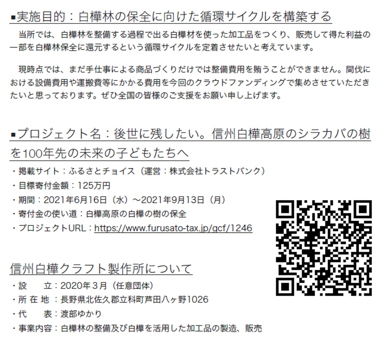 このたび私たちの白樺林保全の活動が立科町で初の地域課題解決事業の対象事業として認定されたことを受けて、白樺林保全に関する寄付を募るガバメントクラウドファンディング(※)を始めることとなりました。