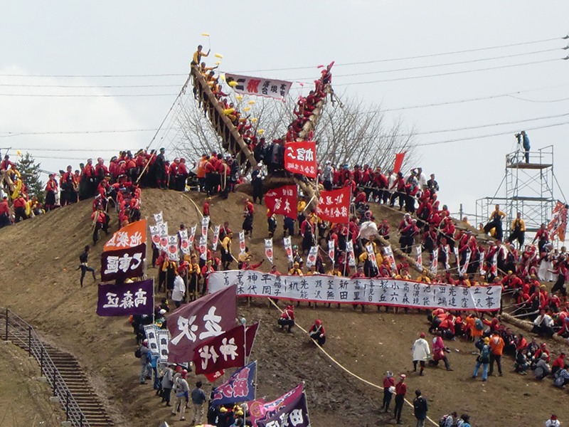 下社の「木落とし」は、最大斜度35度、距離100メートルを御柱の大木に氏子が乗って豪快に滑り落ちる様子がテレビ等で放映されて全国的にもよく知られていますが、上社も「木落とし」や「川越し」など、勇壮そのものです。