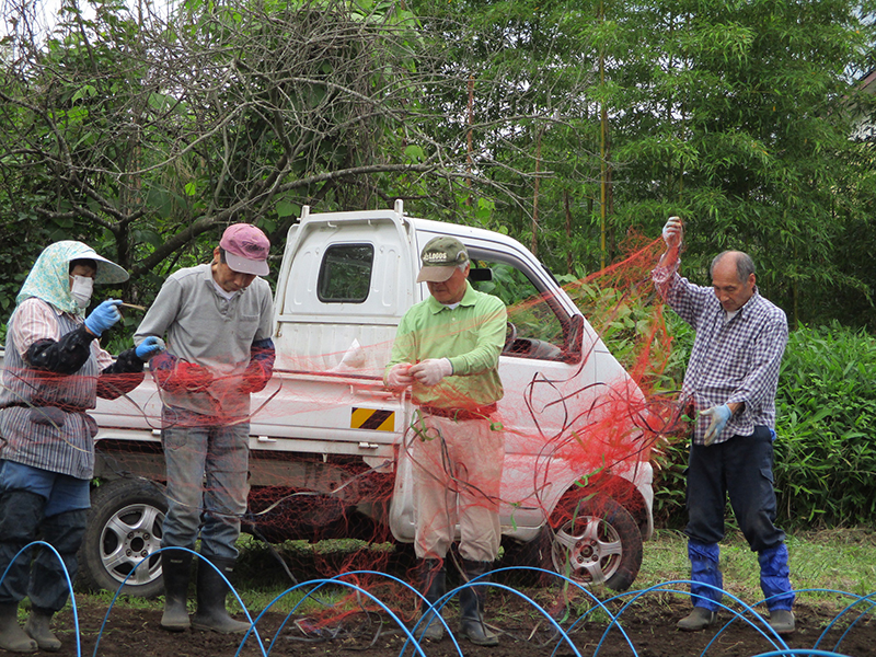 覆土が乾いていたので思いの外仕事が捗りました。最後に「防鳥ネット」を張るのですが、何度も使っているのであちこちに穴が開いている・・・。それを見て「あらら~困ったな?」と言うと、繕いもの上手な仲間が、テープで取りあえず穴を塞ぎ、作業終了です。