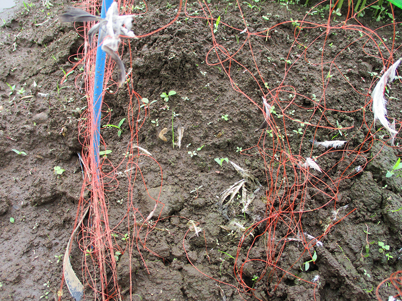 今朝はまっ先に苗床に行き、作業が始まる前に、ハトが入ったと見受けられるネットの穴を確認し、検証しました。ネットの穴は開いていたのか、開けられたのか定かではないが、ネットの中で争った跡の無い事から、ネットの穴の外側に身を潜めて待っていて、出て来た所を不意をつき捕まったのかも・・・と推測しました。