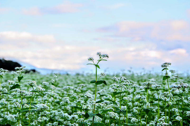 「寒暖の差」、「おいしい湧水が多いこと」、「日照時間の長いこと」といった北杜市の気候が、お蕎麦の栽培に向いているとのこと。日中の強い日差しが去り、夕暮れの涼しい風を受け、気持ちよさそうに揺れる蕎麦の白い花。一つ一つはとても小さな花ですが、畑一面が淡く白く染まる様はなかなか素敵なものです。暑い夏が過ぎ、都心より一足早い秋の訪れを感じさせてくれる風景です。