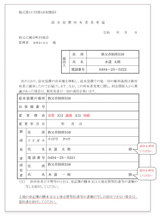 田舎暮らしで人気の秩父市の水道局は、平成28年に1市4町村で水道広域化し秩父広域市町村圏組合によって運営されることになりました。それまでは秩父市のみ、新旧所有者の「印鑑証明書」を添付する必要がありました。明確な理由を聞いたわけではありませんが、水の権利、重要度が他所と異なり、何か歴史的なきっかけがあったのではないかと推測します。