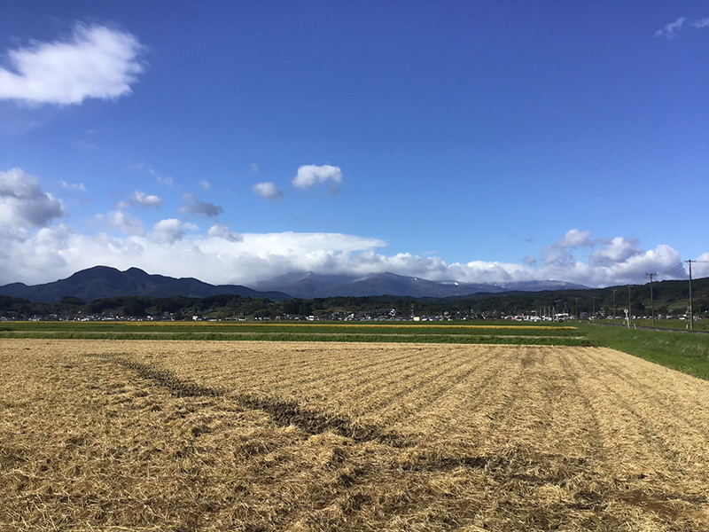 ▲田園の先にある蔵王連山は黒い雲に覆われていた。