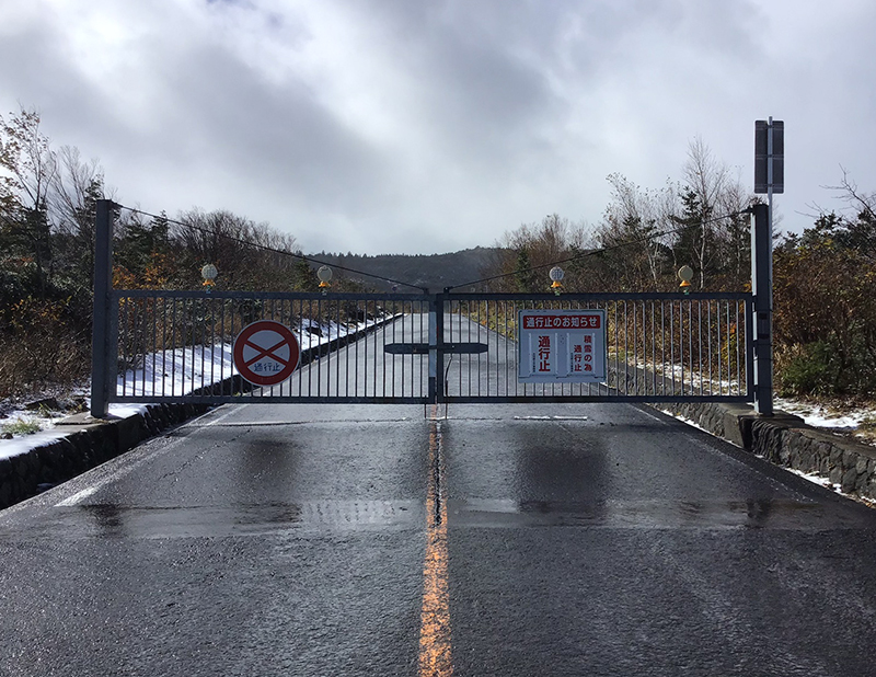 気温はまたたく間に2度まで下がった。氷点下までもわずかだ。キツいカーブを過ぎ、蔵王寺の先にはトイレ休憩できる駐車場があった。ゲートはここで閉ざされていた。