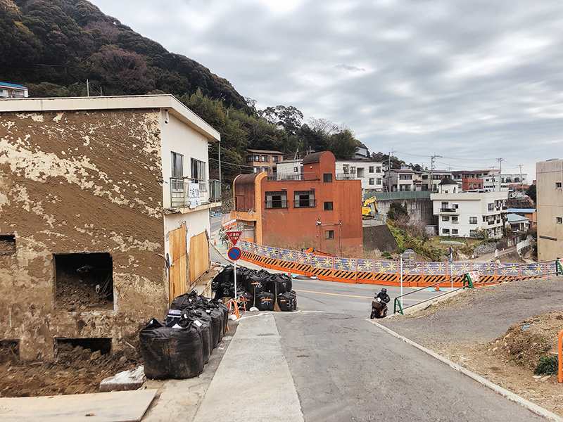 ▲頼朝と政子の逢瀬の場となったのが伊豆山神社境内(写真奥の稜線あたり)「伊豆」の由来となった地名であり、すぐ近くの県道は昨年の土石流の傷痕が残り、各所の復旧も進行形。