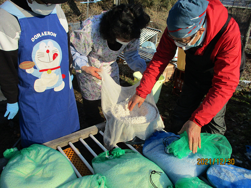 今年は昔のナイスガイ?が14人も揃ったので体の負担にならないように取っ換え、引っ換え時々若者(唯一の)とすばらしいチームワークで順調に進んでいます。それと並行して始まった餅のしが大忙しです。