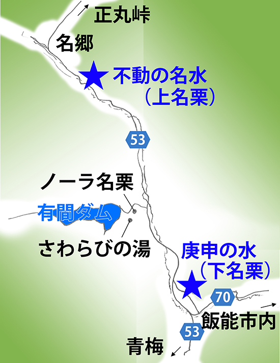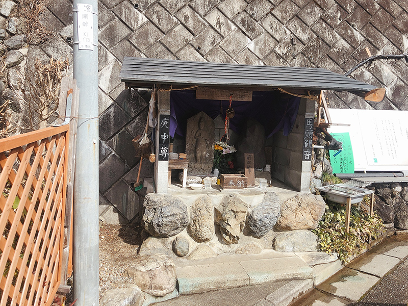 下名栗の旧道にも「庚申(こうしん)の水」という名水があり、こちらは2台ほど停められるスペースがあります。馬頭観音と庚申尊が一緒に祀られ、募金箱が置いてあります。水質検査された安全な湧き水、口コミも100件以上あり、まろやかな美味しいお水のようです。(本部 星野 努)