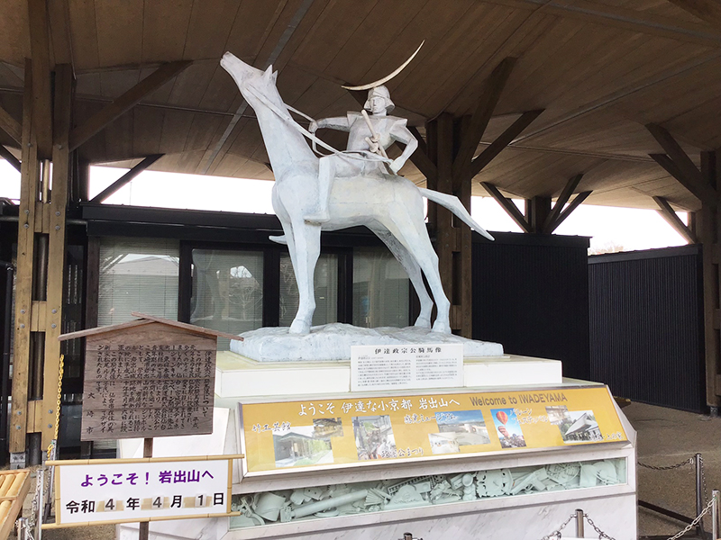 隣接した「東北の駅百選」の有備館駅構内には「伊達政宗公騎馬像」がある。この像はもともと仙台駅にあったもので2008年にこの場所に設置された。(日付とは関係なくウソではありません。)