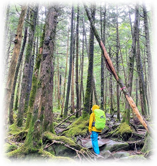 ▲雨の中の登山。そこに山がある限り・・・。(白駒池・丸山の苔の森)