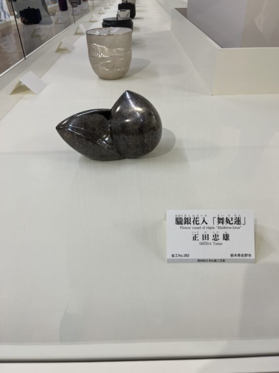 入選された正田さんの作品は朧銀花入(おぼろぎんはないれ)「舞妃蓮(まいひれん)」と言います。「舞妃蓮」は東日本で最も高貴で美しい蓮(はす)と言われています。その蓮の蕾をモチーフとして花入にしたそうです。