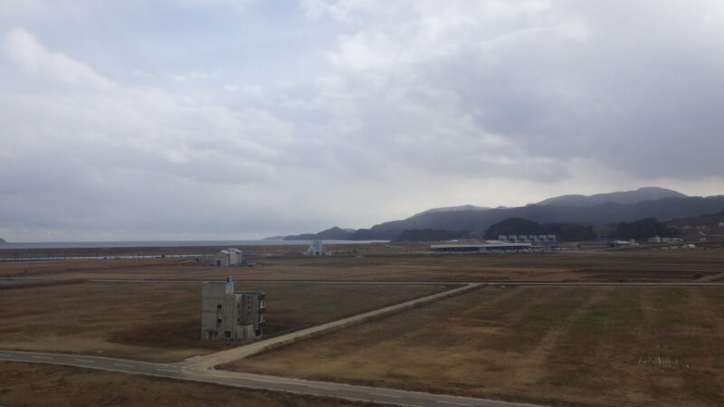 ▲博物館屋上の展望デッキより。太平洋や防潮堤、新旧道の駅などが見渡せる。