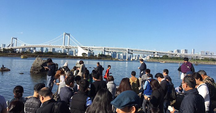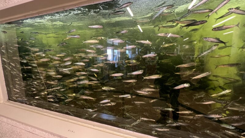 施設に入ると大きな水槽があり約3,000匹のイワシがお出迎え。水槽一面がイワシだった。