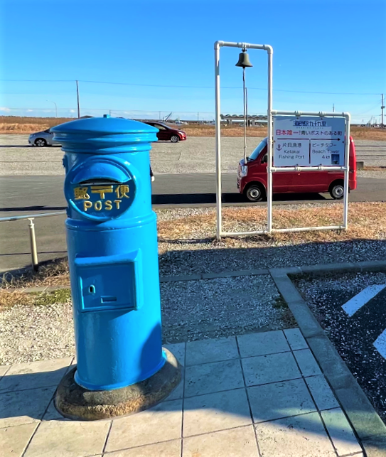 また、外には青い空と海をイメージした日本で唯一の「青い丸型郵便ポスト」がある。