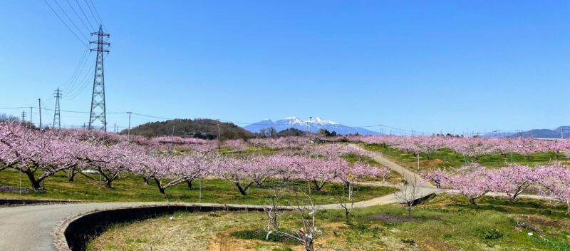 武田氏最後の城となった新府城跡に隣接しており、駐車場はそちらを使うと良いでしょう。周囲より小高い、新府城の本丸跡地まで息を上げながら登ると、眼下にピンクに染まった桃畑、その遠方に八ヶ岳の峰々の景色。新府城跡は桜の名所でもあるので、一度に桜と桃の両方の花見を楽しむことが出来ます。