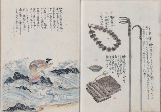 浦乙女が熊手のような漁具で荒磯の藻に付いた「ぶりこ」をかき寄せ、それを腰に付けた「こだす」(編籠)にとり入れている姿絵。