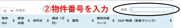 右上の検索欄にお探しの物件番号をいれて検索し、右端の写真をクリックすればご覧になれます。(写真の上をクリックしてください。「物件ページへ」だと資料へのご案内になります)検索しても画像が出てこない場合は、画像のご用意がありません。