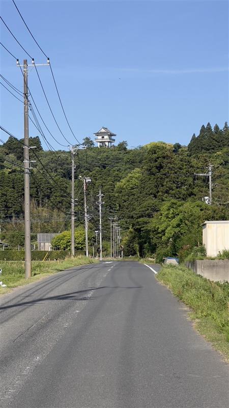 ▲夷隅川を渡ると天守閣をかたどった展望台が見える。